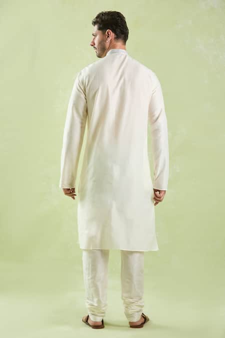 Cream kurta featuring a band collar and embroidered placket. Paired with a matching cream churidar made of art silk.