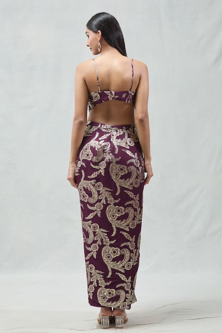 Wine Lurex, Georgette Crystals V-neck Embellished Draped Dress