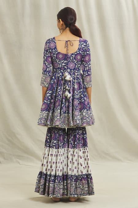 Blue Cotton Embroidery V-neck Daisy Print Anarkali Sharara Set