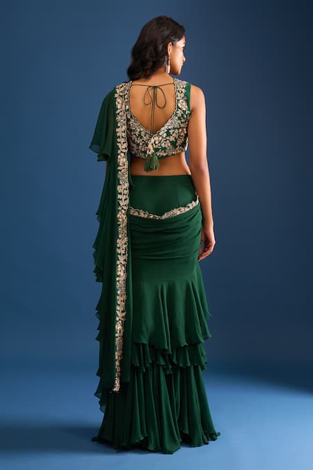Dark green pre-draped saree featuring heavy aari work, sequins, and cutdana embellishments. Accompanied by a padded blouse with hand embroidery and attached lining.