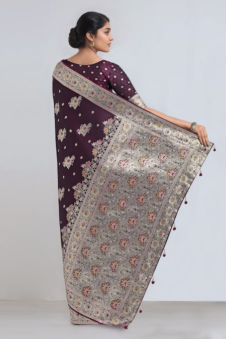 Wine Tassels, Zari Round Neck Dark Woven Banarasi Saree With Blouse