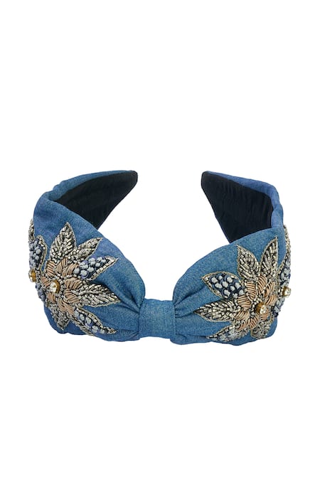 Blue Beads, Sequins Denim Flower Design Hand Embroidered Hairband