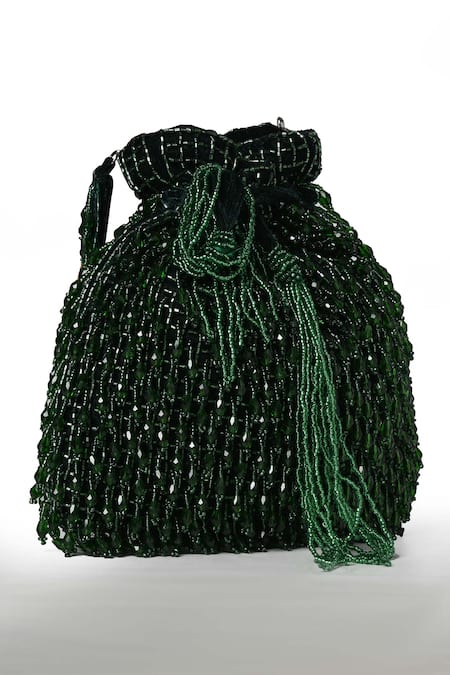 Green potli bag featuring intricate hand embroidery and embellishments