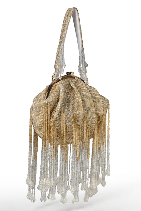 Gold Embroidery, Beads Designer Handbag With Fringe Embellishments