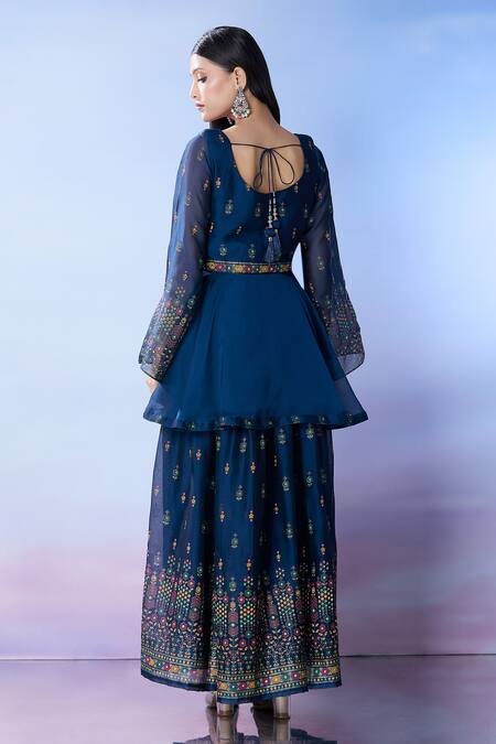 Blue embroidered anarkali featuring cutdana and thread work with flared sleeves. Paired with an embroidered palazzo and dupatta.
