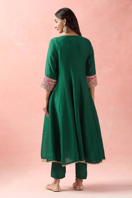 Green anarkali featuring gota and dori embroidery. Paired with a scallop hem dupatta and relaxed fit pant.