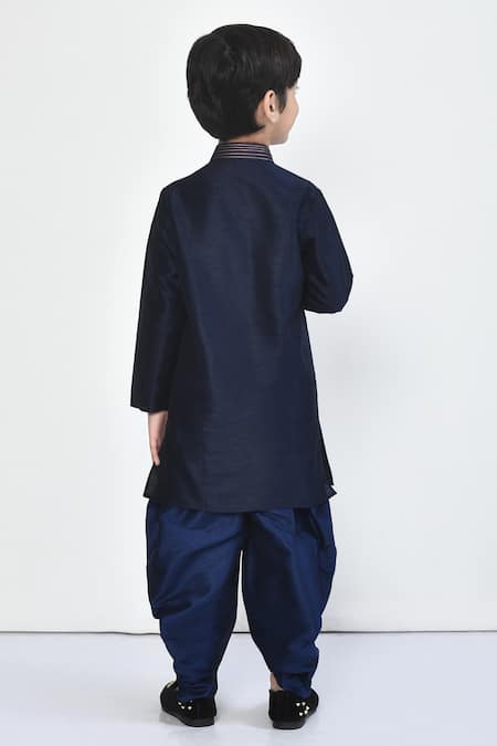 Navy blue kurta featuring a band collar with thread embroidery on the collar and placket. Paired with an elasticated waistband dhoti pant in coordinating navy blue.