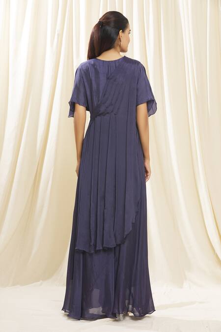 Placement floral pattern embroidery on the kurta., Pleated draped overlap asymmetric panel design., Side high slit for added flair.
