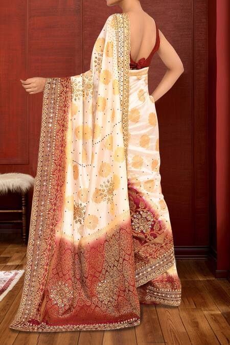 White art silk saree featuring floral embroidery with embroidered borders. Paired with a running maroon blouse piece measuring 0.80 meters.