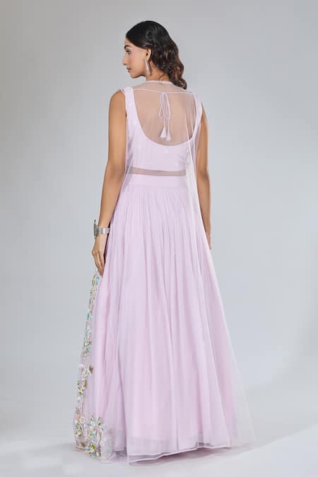 Purple embroidered lehenga featuring a cutdana and pearl work. Paired with a floral embroidered blouse and a net jacket.