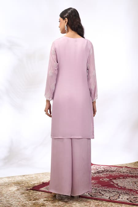 A lilac georgette kurta with lining, featuring intricate hand embroidery. Paired with coordinating sharara pants and a sheer dupatta.