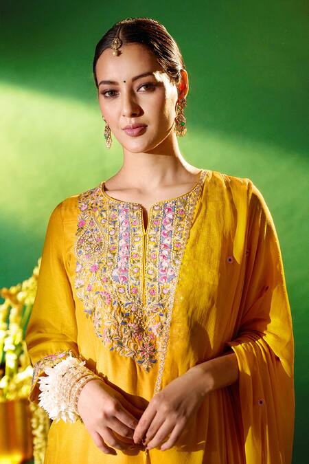 A mustard Russian silk kurta featuring machine embroidery details on the yoke and a cotton voile lining. It is paired with a shantoon sharara with a drawstring closure and a chiffon dupatta.