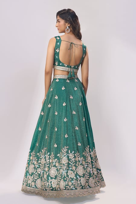 A green tissue lehenga featuring intricate machine and hand embroidery, an attached can-can, and a drawstring closure. It is paired with a matching blouse and a coordinating dupatta.