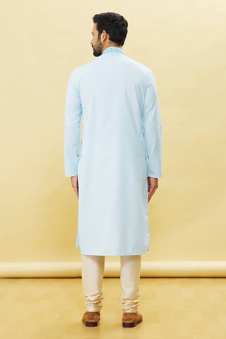 Buy_Arihant Rai Sinha_Sky Blue Silk, Cotton Embroidery Paisley Placket Kurta Churidar Set _Online_at_Aza_Fashions