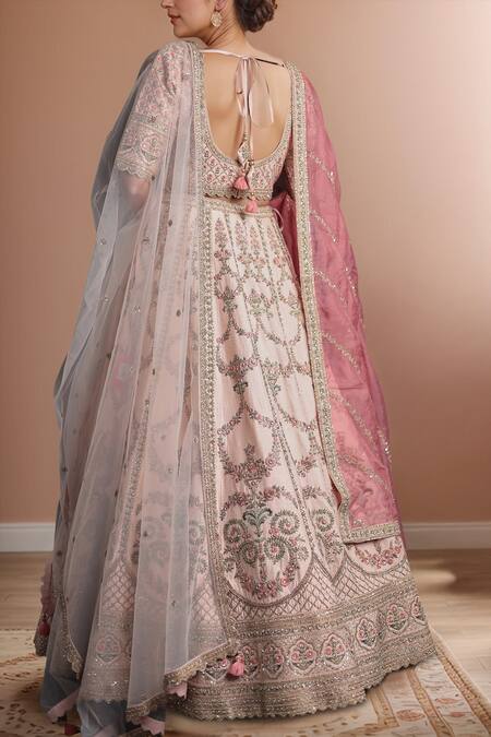 Intricate floral embroidery on lehenga, Can-can detailing for volume, Stripe pattern embroidery on dupatta