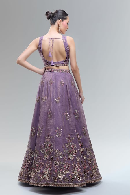 Purple Tissue, Net Embroidery, Beads, Sequins, Zari, Stones V-neck Lehenga Set