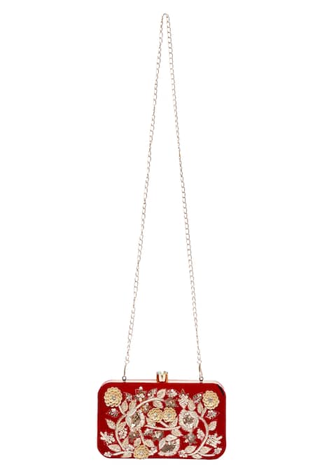 Red velvet clutch featuring intricate hand embroidery with floral motifs and embellishments. Includes a detachable chain strap for versatility.
