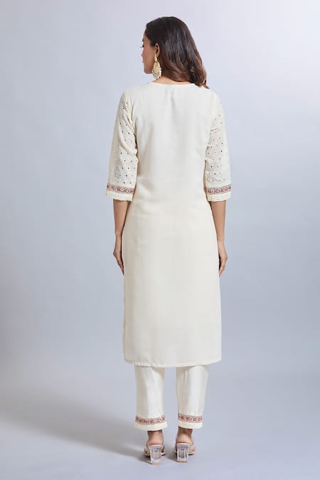 White embroidered kurta featuring a round neckline and three-quarter sleeves. Paired with tapered pants and a floral dupatta in viscose jacquard.