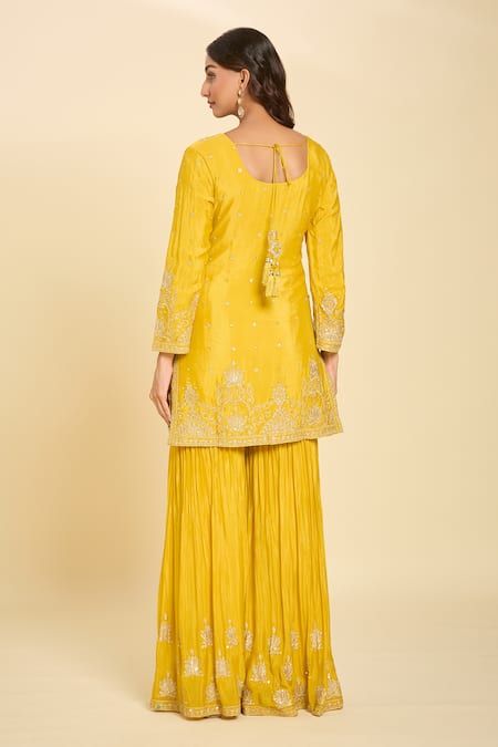Yellow straight kurta featuring botanical embroidery with a notched neckline and full sleeves. Paired with an embroidered gharara and a sheer dupatta.