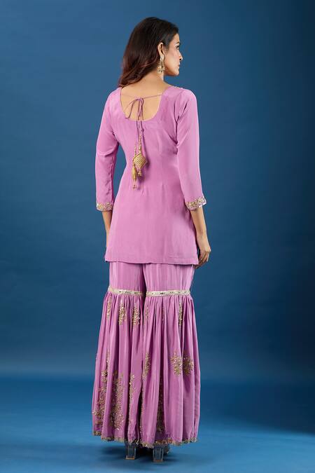 Purple crepe kurta featuring hand embroidery with zardozi and sequence details on the yoke and hem. Paired with a matching crepe gharara with similar embroidery and an organza dupatta embellished with sequences.