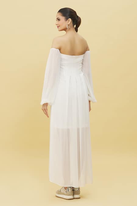 White Georgette Sweetheart Neck Flared Off Shoulder Dress