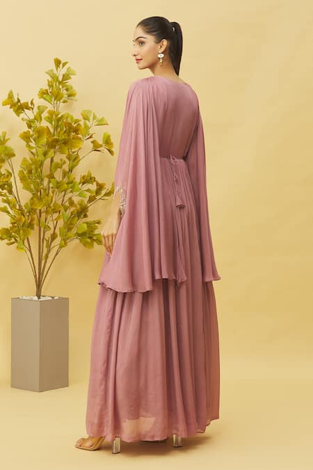 Pink chinon gown featuring zardosi embroidered yoke and cuffs with pleats. Comes with a detachable belt and attached lining.