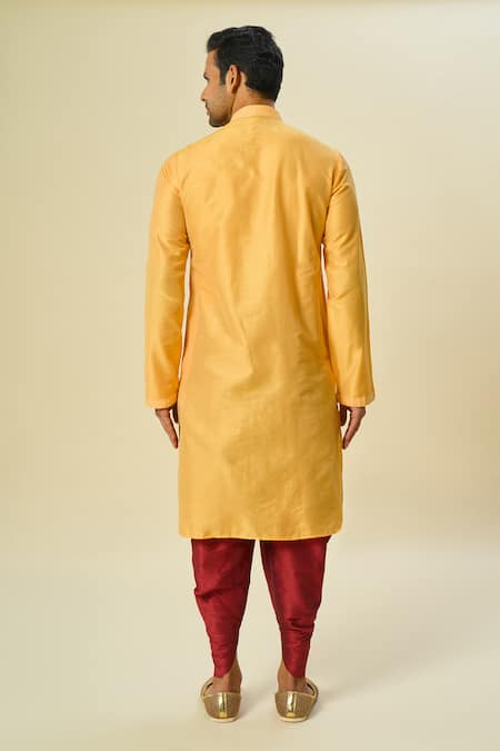 Yellow kurta featuring full sleeves and flora vine embroidery on the placket. Paired with maroon patiala pant for a coordinated look.