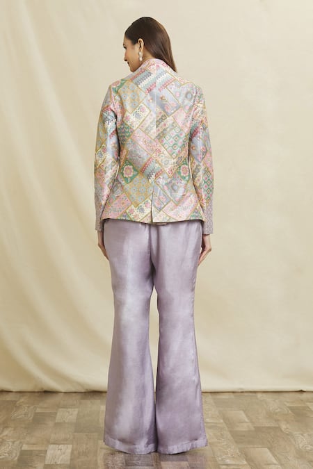 Purple Silk Embroidery Square Neck Floral Art Embellished Blazer Pant Set