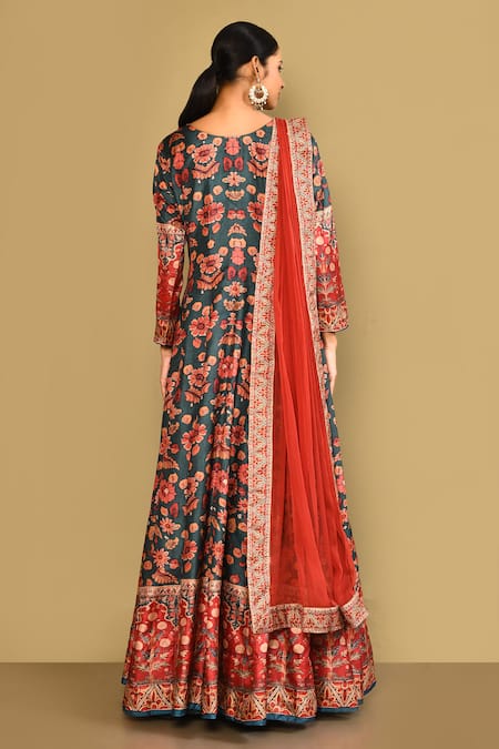 Embroidery detailing on the neckline, Intricate border on the dupatta, Floral digital print on the anarkali