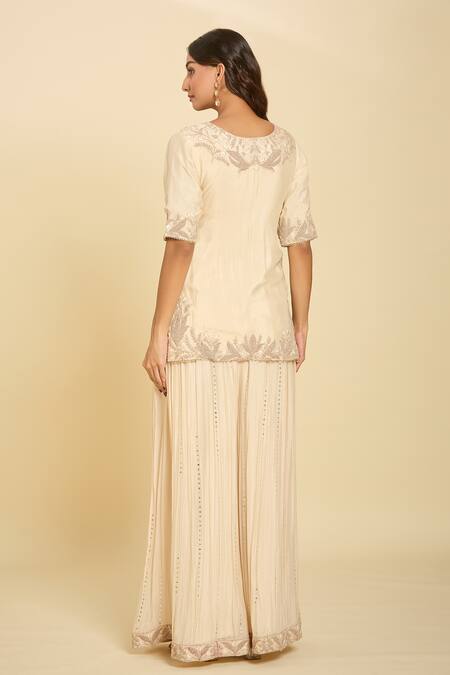 Ivory kurta featuring dori embroidery in a floral pattern. Paired with a dori and sequin embroidered sharara and a sheer dupatta.