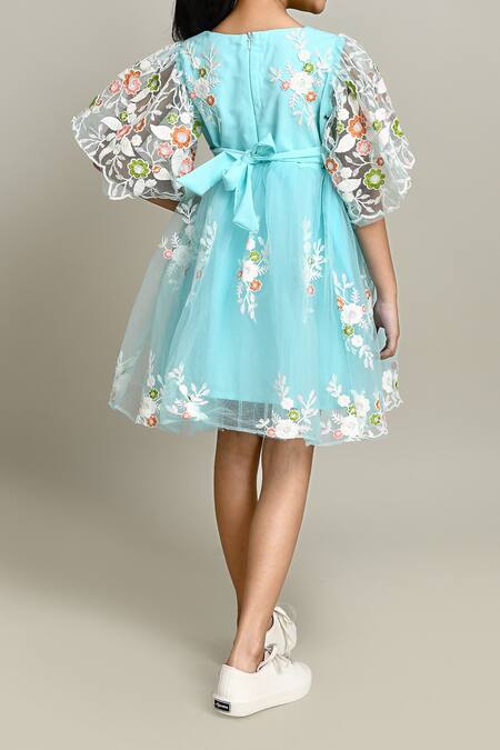 Light blue fit and flare dress featuring floral embroidery and sheer puff sleeves