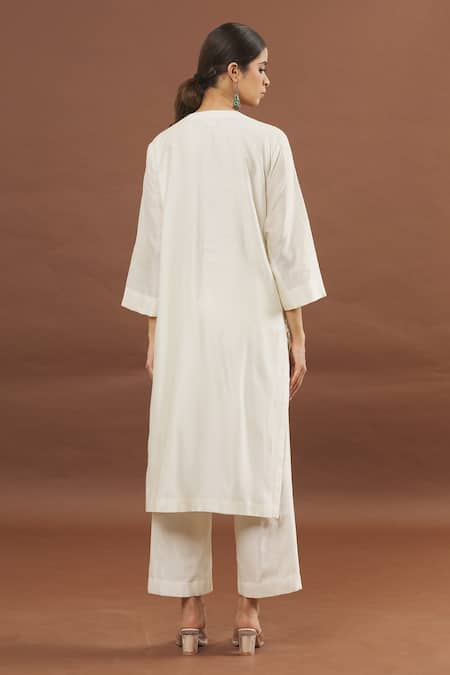 Ivory silk chanderi kurta featuring all-over floral embroidery and a center slit. Paired with a straight pant for a coordinated look.