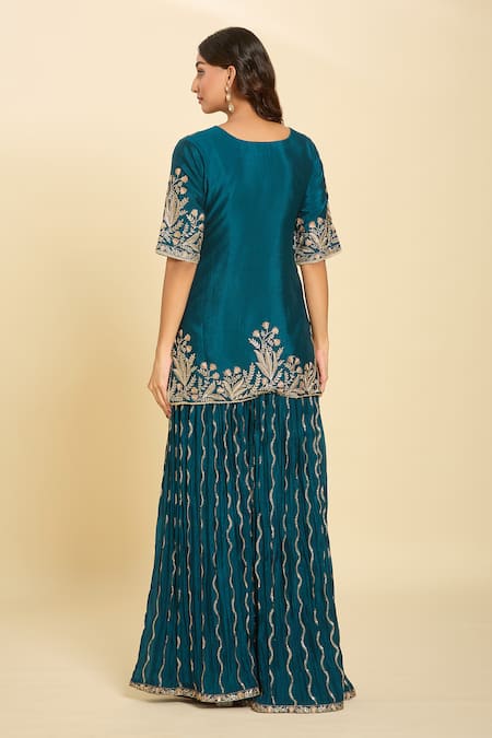 Teal blue kurta featuring dori embroidery in floral pattern. Paired with a dori & sequin embroidered sharara and a sheer dupatta.