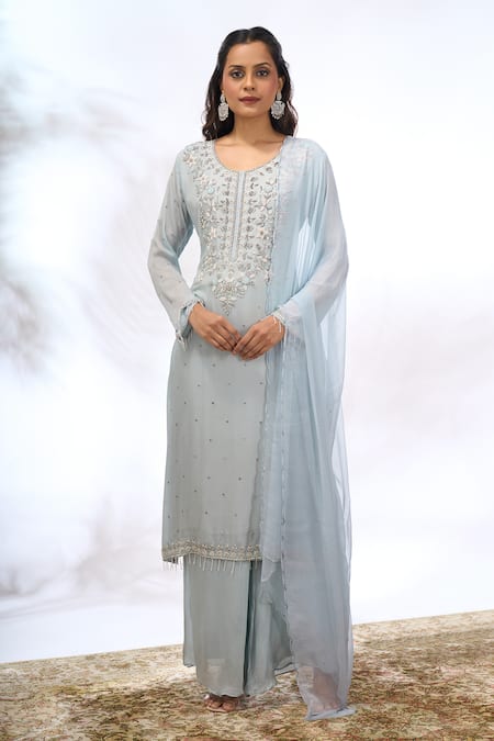 A light blue georgette kurta featuring intricate hand embroidery with floral motifs on the yoke, scattered embellishments on the body, and a delicate beaded hemline. It is paired with coordinating light blue georgette wide-leg pants and a matching light blue georgette dupatta.