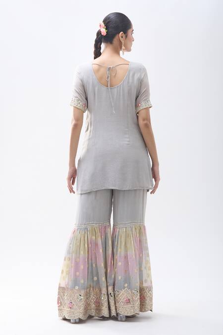 Grey straight kurta featuring floral embroidery in gota and mirror work. Paired with an embroidered sharara and a scallop hem dupatta.