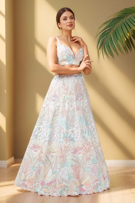 Cream Net, Linen Sequins, Cut Work, Embroidery Sweetheart Floral Lehenga Set