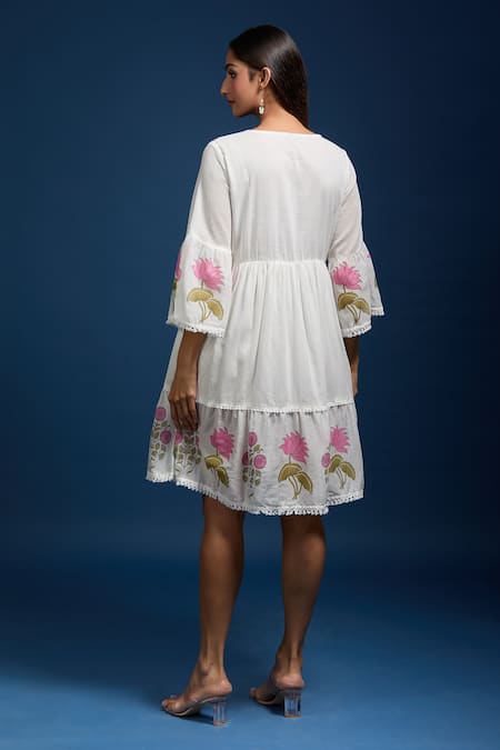 Floral embroidery on the bodice and hem, Tassel detail at the neckline, Fringed edges on sleeves