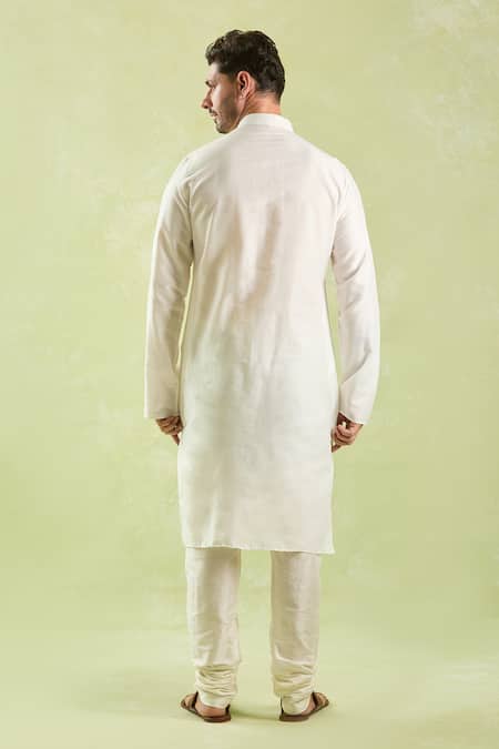 Cream kurta featuring a stand collar and full sleeves with contrast floral embroidered placket. Paired with an off white churidar made from art silk.