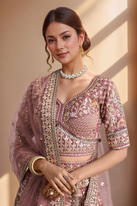 Purple lehenga featuring floral and geometric embroidery with zari, gota, thread, sequins, and stones. Paired with a coordinating padded blouse, dupatta, and belt.