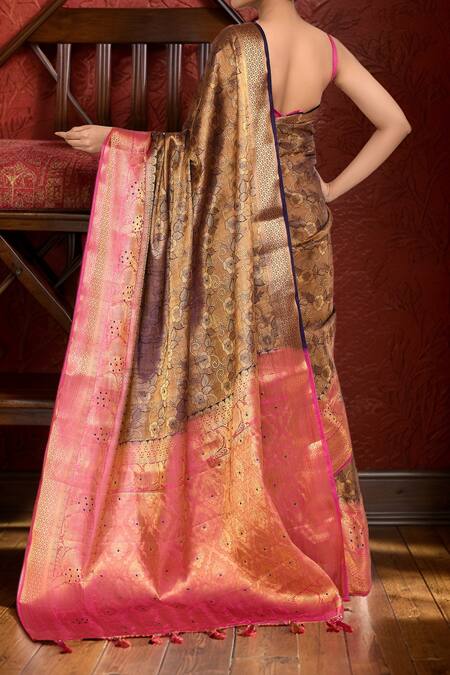 Floral motifs intricately embroidered on the saree, Crystal embellishments enhancing the design, Rich kanjeevaram silk fabric with a luxurious sheen
