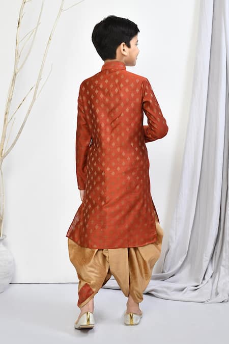Rust brocade kurta featuring all-over floral woven patterns. Paired with dark beige dhoti pant with rust brocade border.