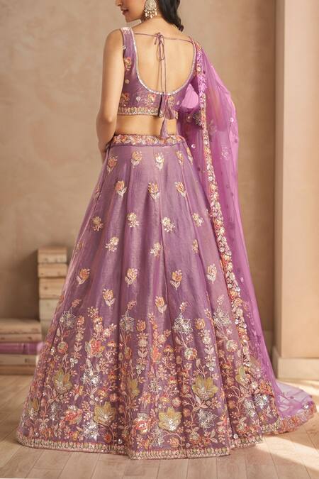 Purple lehenga featuring floral patchwork and intricate embroidery with thread, sequin, and zari. Paired with a coordinating padded blouse, dupatta, and a belt.