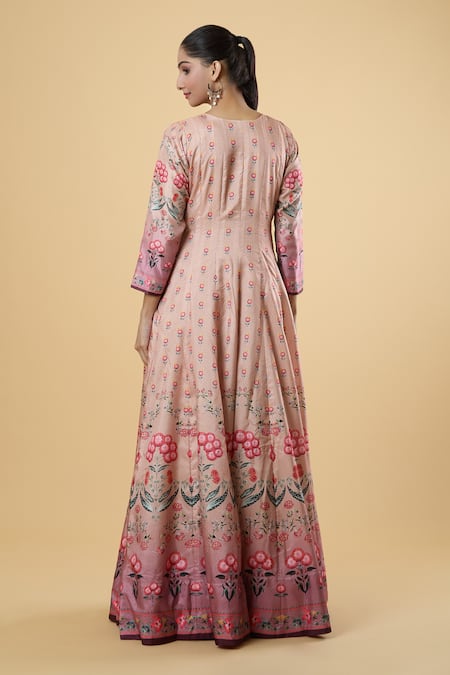 Pink floral hand embroidered Anarkali featuring a round neckline and three-quarter sleeves. Paired with a matching chinon dupatta adorned with a floral print.