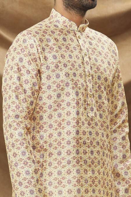 Yellow thread work kurta featuring a floral pattern and mandarin collar. Paired with a cream churidar made from Art Banarasi Silk.