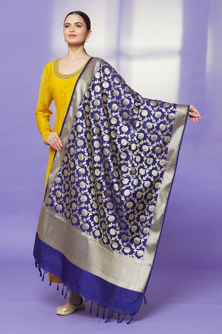 Blue Chanderi Silk Fringe Floral Pattern Navy Dupatta