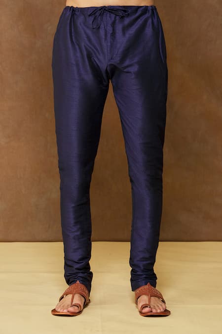 Blue kurta featuring all over woven floral butti pattern with resham embroidered mandarin collar. Paired with art banarasi silk gathered churidar.