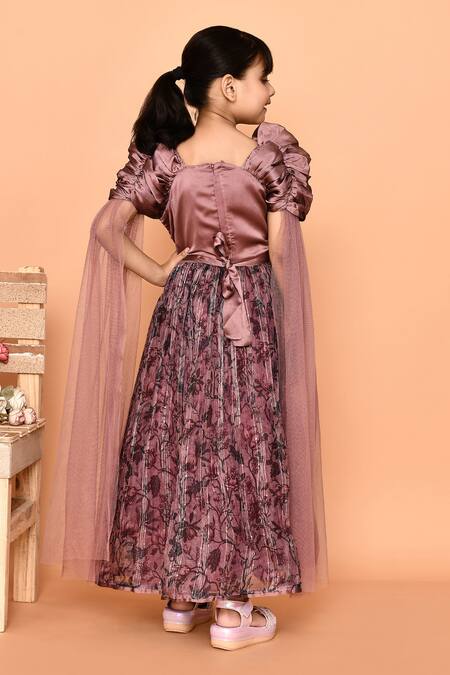 Floral print with bead and stone embroidery, Pleated design with flowing cape sleeves, Square neckline with puff sleeve detailing