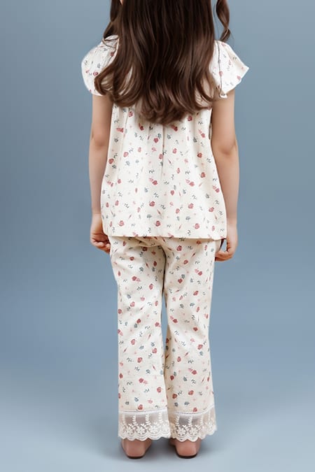 Off white kids pant set featuring a floral print top with lace detailing. Paired with matching off white pant made from cotton fabric.