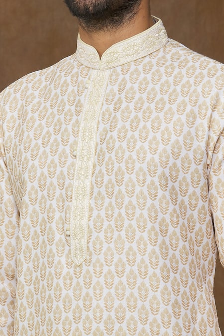 Yellow kurta featuring floral motif digital prints with a mandarin neckline. Paired with an off-white churidar in art banarasi silk with a drawstring closure.