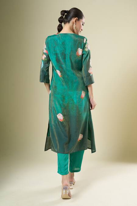 Green Muslin Embroidery V-neck Floral Print Kurta Set